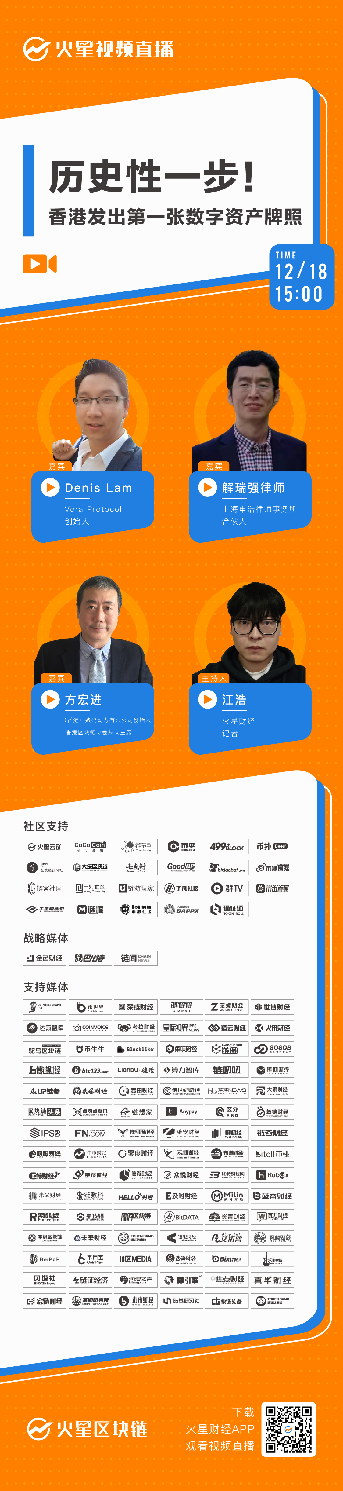 12月18日,MarsBit视频直播邀请到了香港区块链协会共同主席方宏进、Vera Protocol 创始人Denis Lam和上海申浩律师事务所合伙人解瑞强律师,就“香港发出第一张数字资产牌照”话题进行讨论,敬请期待~